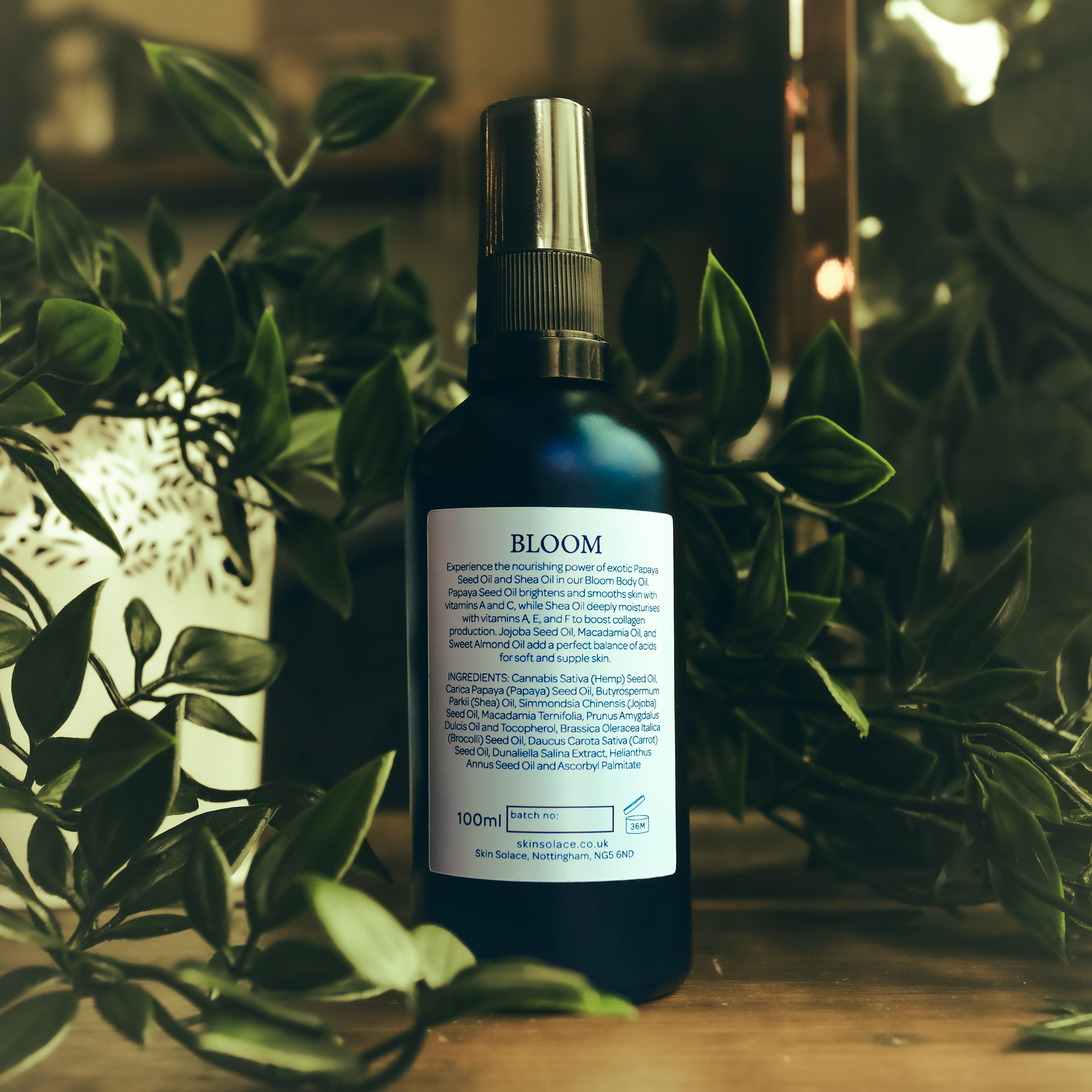 To enhance the oil's skin-protective qualities, Vitamin E, Broccoli Seed Oil, Carrot Seed Oil, Sunflower Seed Oil, and Vitamin C are included. These ingredients are powerful antioxidants that protect the skin from environmental stressors, improve elasticity, and promote even skin tone. This blend not only deeply moisturises and revitalises the skin but also supports skin health with its potent mix of vitamins and antioxidants, making Skin Solace Body Oil a comprehensive care solution for a radiant, youthful complexion.