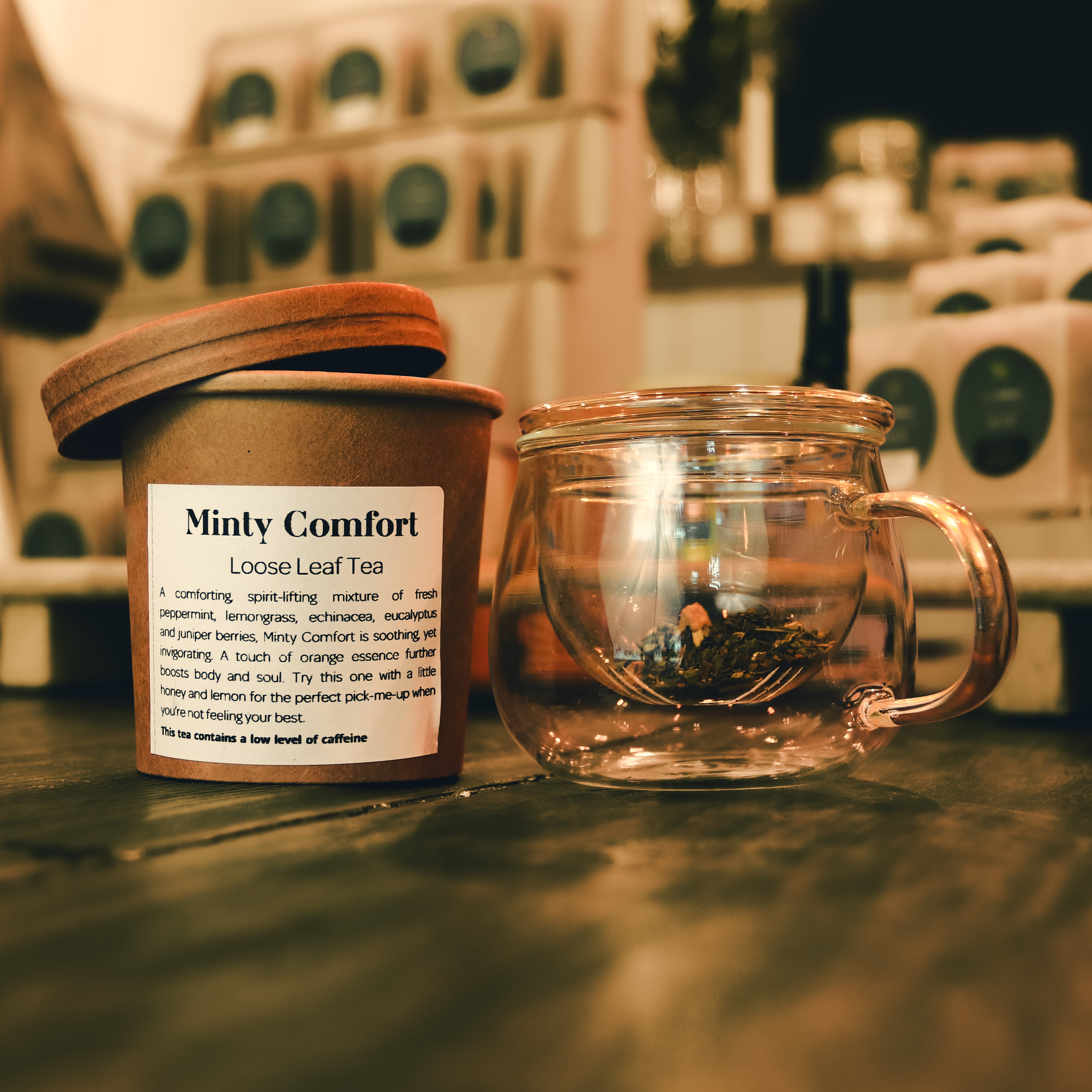 A comforting, spirit-lifting mixture of fresh peppermint, lemongrass, echinacea, eucalyptus and juniper berries, Minty Comfort is soothing, yet invigorating. A touch of orange essence further boosts body and soul. Try this one with a little honey and lemon for the perfect pick-me-up when you’re not feeling your best