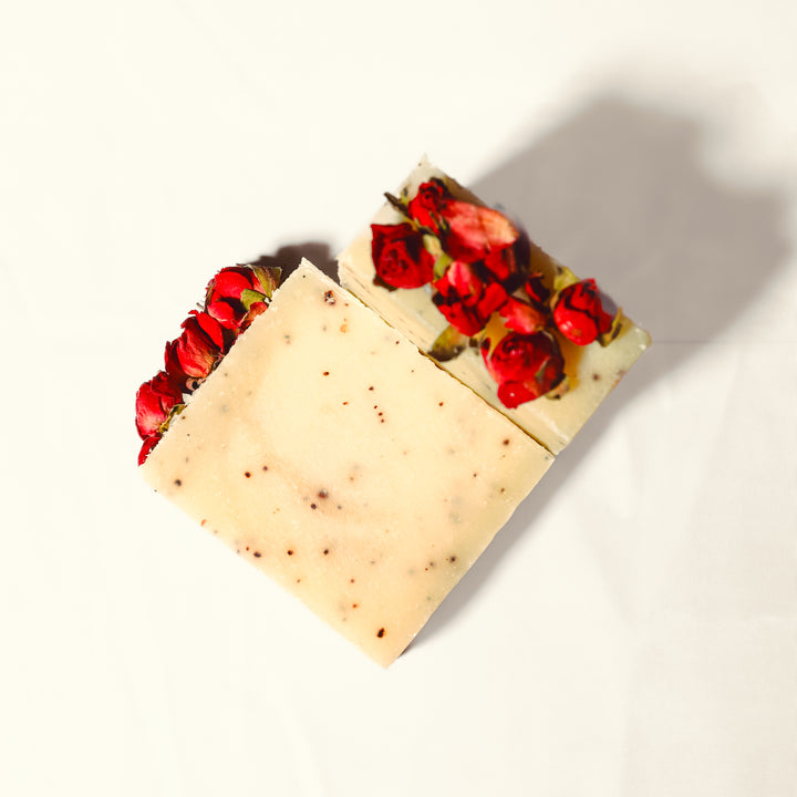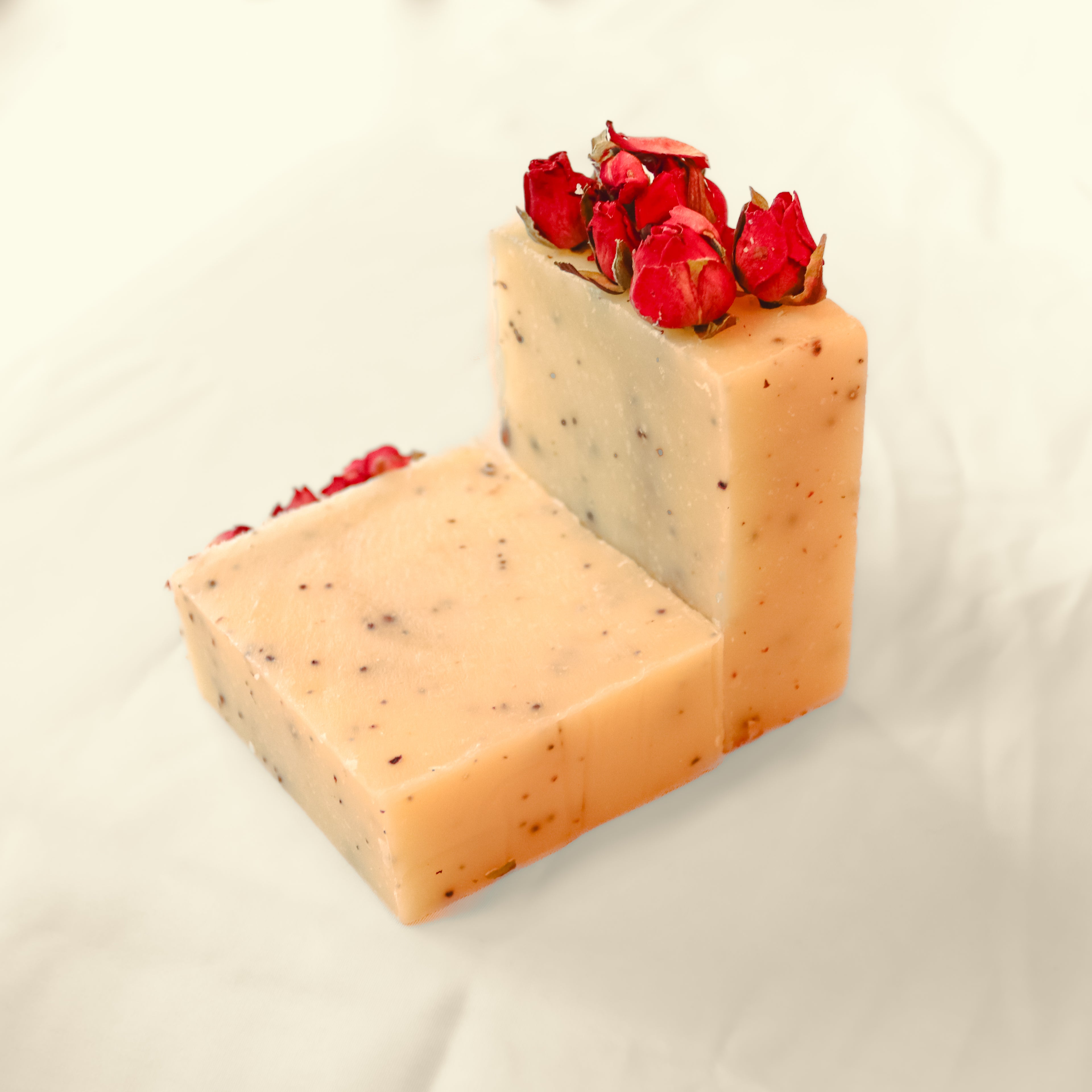Such a beautiful soap made with cocoa butter olive oil, and sunflower with the addition of ground rosehips which has nourishing skin benefits. Infused with essential oils of rose geranium, petitgrain and ylang-ylang creating a delightful settling aroma and decorated with beautiful dark red rose buds.